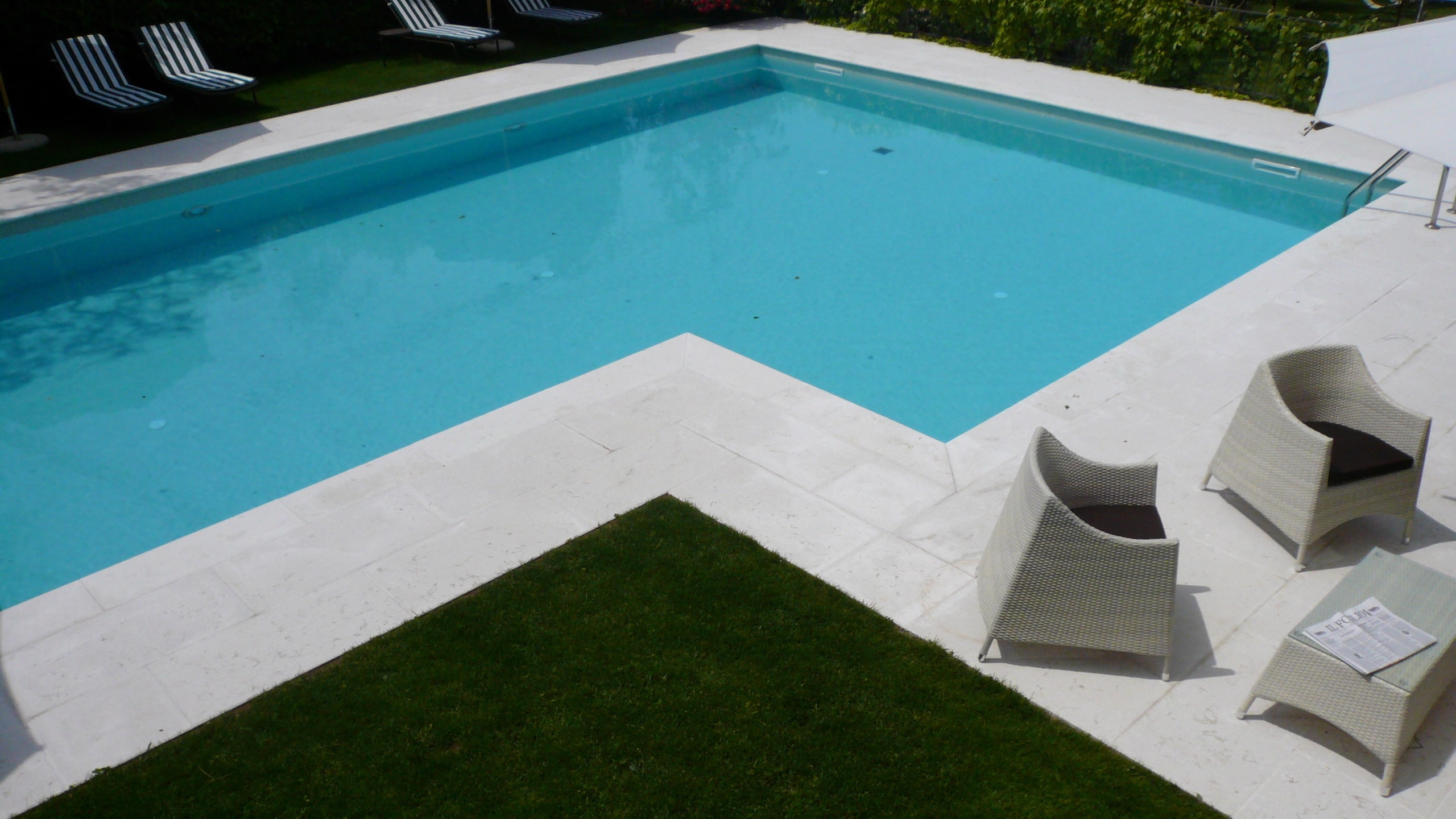swimming pool, surrounded by green lawns and trees. There is a